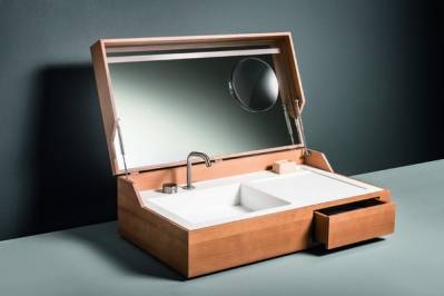 Чистота – залог здоровья. Но иногда нет возможности не то что принять душ, но и умыться. Специально для таких случаев дизайнер Giulio Gianturco придумал мобильную модель переносного умывальника, которая включает в себя: раковину, смеситель, подсветку, ящик для гигиенических принадлежностей и зеркало.